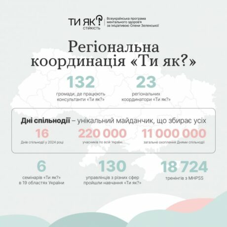 «Україна бореться не лише проти нападника, а й за кожну свою людину. За її збереження та розвиток. Це значить – і за ментальний добробут також, за здатність прожити й пережити будь-який досвід і віднайти нові сили. Весь 2024-й на це працювала Всеукраїнська програма ментального здоров’я “Ти як?”. Тисячі людей різних професій опановували навички підтримки ментального здоров’я, щоб допомогти іншим, щоб ця допомога була в потрібний час і якнайближче», – зазначила Олена Зеленська.