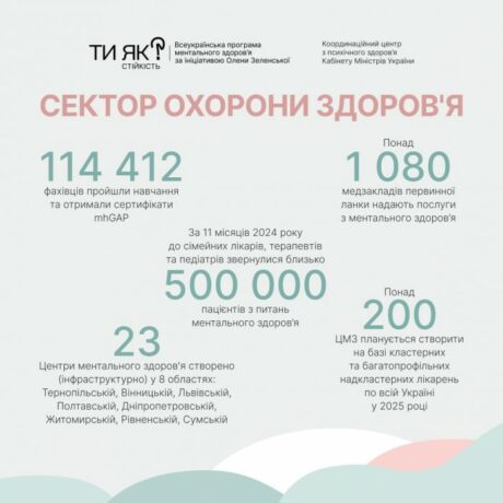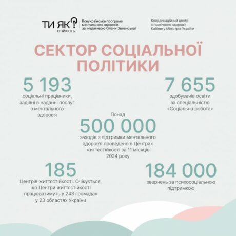 Крім того, у різних регіонах України функціонують 185 центрів життєстійкості, де цьогоріч провели понад пів мільйона консультацій, тренінгів та зустрічей різних груп взаємопідтримки.