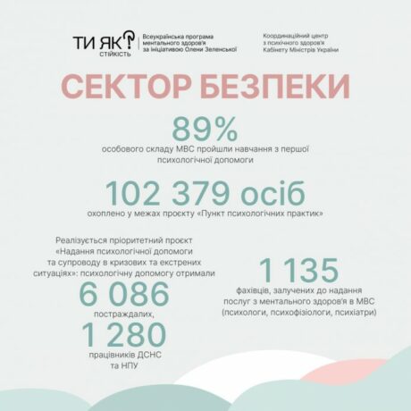 Сектор безпеки. 89 % особового складу Міністерства внутрішніх справ пройшли навчання з першої психологічної допомоги. Відомство напрацювало алгоритм підтримки та супроводу в кризових та екстрених ситуаціях, запровадило функціональну підсистему «Соціально-правовий захист постраждалих та членів їхніх сімей» і створило проєкт «Пункт психологічних практик» для підтримання ментального здоров’я постраждалих і членів їхніх сімей.