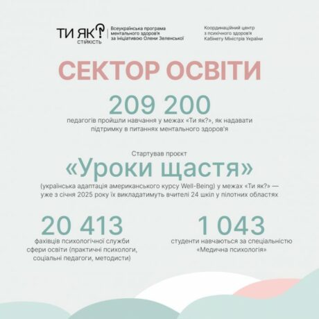 Основні пріоритети у сфері освіти – зміни психологічної служби в освітніх закладах, інтеграція навичок піклування про ментальне здоров’я в навчання та оновлення освітніх програм відповідно до сучасних реалій. Майже 210 тис. педагогів цьогоріч пройшли спеціальне навчання в межах «Ти як?», щоб уміти надавати школярам підтримку в питаннях ментального здоров’я.