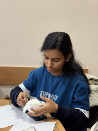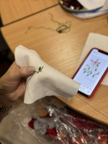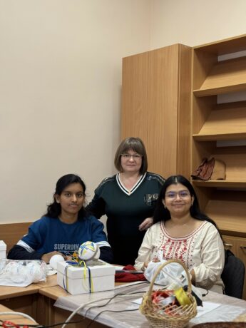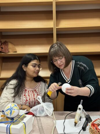 Для цих зустрічей гостинно надала необхідне приміщення бібліотека ТНМУ. Хочемо подякувати працівницям бібліотеки за їхню допомогу та увагу. Світлана Шпунар продемонструвала для учасниць основні етапи роботи над іграшкою, Ірина Стасишин та Леся Даценко допомагали у їх виготовленні. Директорка бібліотеки Олена Проців розповіла про те, як працівники бібліотеки згуртувалися навколо проєкту «Вишиті символи доброчинності», якими були перші кроки у виготовленні цих ялинкових прикрас. Адже до нас приєдналися ще і учасниці Українського клубу, студентки-індійки Shreyoshree Sheel та Thejashree Thavanithi. Як розповіли дівчата, вони вже уміли вишивати і дуже люблять рукоділля. Тому охоче взяли участь у такому майстер-класі.