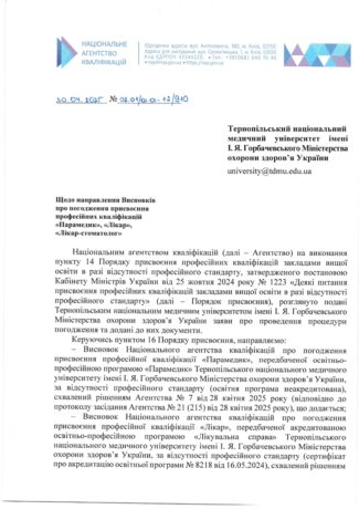 Тернопільський національний медичний університет імені І. Я. Горбачевського Міністерства охорони здоров’я України отримав позитивні висновки Національного агентства кваліфікацій щодо погодження присвоєння професійних кваліфікацій за трьома освітніми програмами (https://eq-sector.tdmu.edu.ua/%D0%BF%D1%80%D0%B8%D1%81%D0%B2%D0%BE%D1%94%D0%BD%D0%BD%D1%8F-%D0%BF%D1%80%D0%BE%D1%84%D0%B5%D1%81%D1%96%D0%B9%D0%BD%D0%B8%D1%85-%D0%BA%D0%B2%D0%B0%D0%BB%D1%96%D1%84%D1%96%D0%BA%D0%B0%D1%86%D1%96%D0%B9).