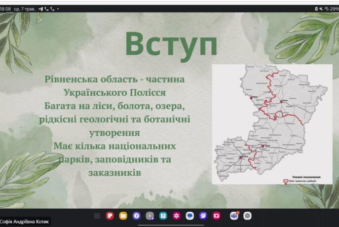 Доповідь Софії Котик була щирою та яскравою – студентка ММ-217 розповіла про Тунель кохання у Клевані, базальтові стовпи (с. Базальтове), які є геологічною цінністю місцевого значення, також популярне для риболовлі та відпочинку озеро Нобель.