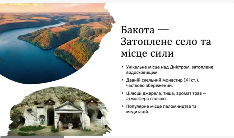 Також, надзвичайно мальовничими й цікавими є Подільські Товтри та затоплене село Бакота.