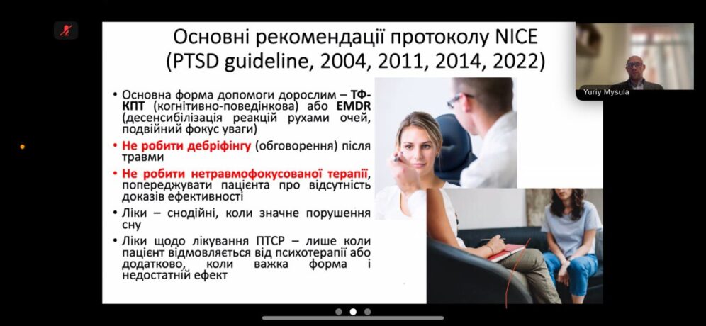 Професор Юрій Мисула наголосив на важливості вчасного розпізнавання симптомів ПТСР та необхідності інтеграції практик саморегуляції у повсякденне життя як медичних працівників, так і пацієнтів. Особливу увагу було приділено помилкам у клінічній практиці при роботі з ПТСР та способам їх уникнення.