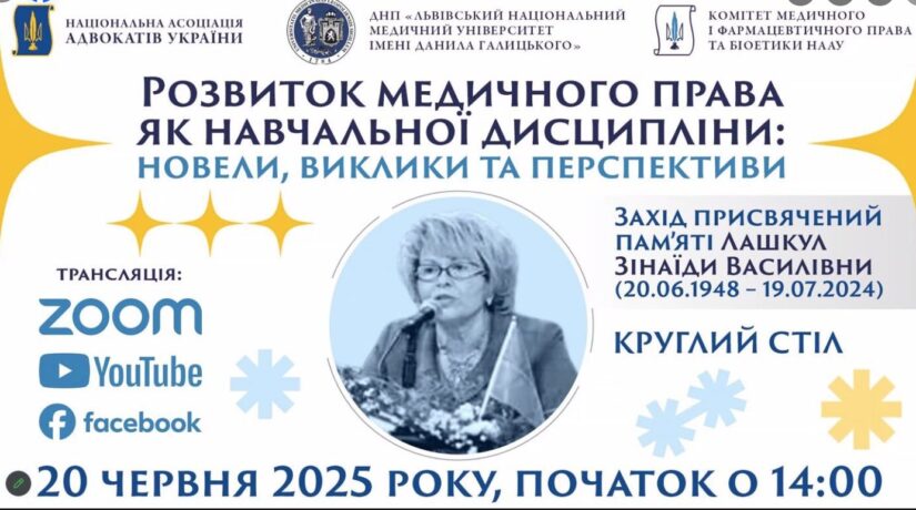 20 червня 2025 року під егідою Комітету медичного і фармацевтичного права та біоетики Національної академії адвокатури України та Національної асоціації адвокатів України відбувся науково-практичний «круглий» стіл «Розвиток медичного права як навчальної дисципліни: новели, виклики та перспективи». Захід було присвячено памʼяті заслуженого лікаря України, доктора медичних наук, професора Зінаїди Василівни Лашкул, яка зробила вагомий внесок у розвиток медичного права і запровадження викладання цієї дисципліни у медичних вишах України.