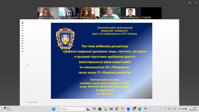 Професор В. Франчук ознайомив присутніх з досвідом викладання у ТНМУ нової вибіркової дисципліни «Дефекти медичної допомоги: види, причини, наслідки», окремо акцентувавши увагу на необхідності знання майбутніми лікарями свого правового статусу, нормативних документів МОЗ України, які регламентують надання медичної допомоги, задля запобігання недоліків лікувально-діагностичної роботи і убезпечення лікарів від можливих судових позовів.
