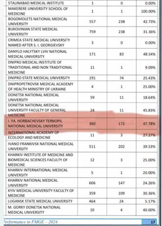 Згідно з опублікованими результатами успішності складання ліцензійного іспиту в Індії серед випускників, які навчалися в медичних вишах інших країн, Тернопільський національний медичний університет посідає одне з перших місць серед українських ЗВО. У підсумковій таблиці відображені результати складання Індійського ліцензійного іспиту (FMGE) за 2024 рік. Відсоток успішності випускників ТНМУ становить – 47,78%.