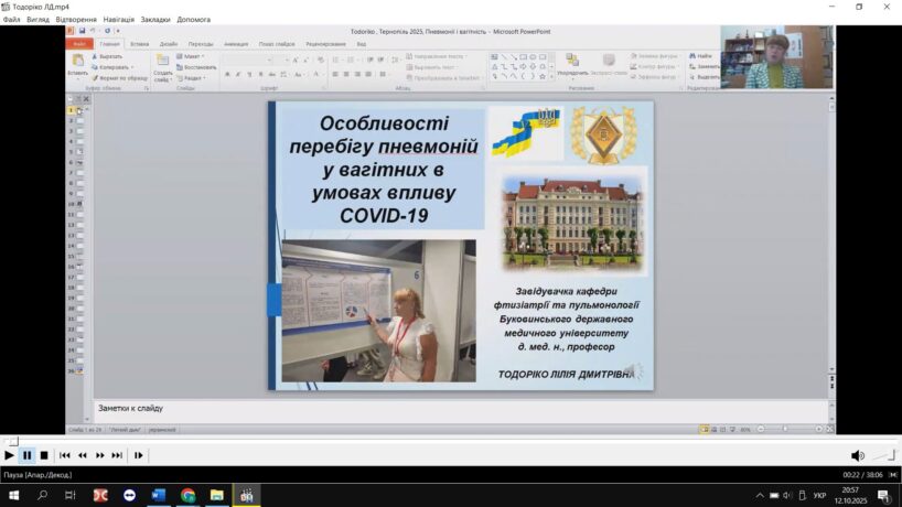 Професор Лілія Тодоріко (Буковинський державний медичний університет, Харківський національний медичний університет) представила доповідь на тему «Особливості перебігу пневмоній у вагітних, в умовах впливу COVID 19».