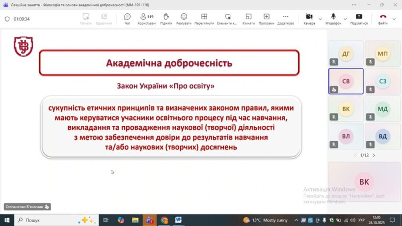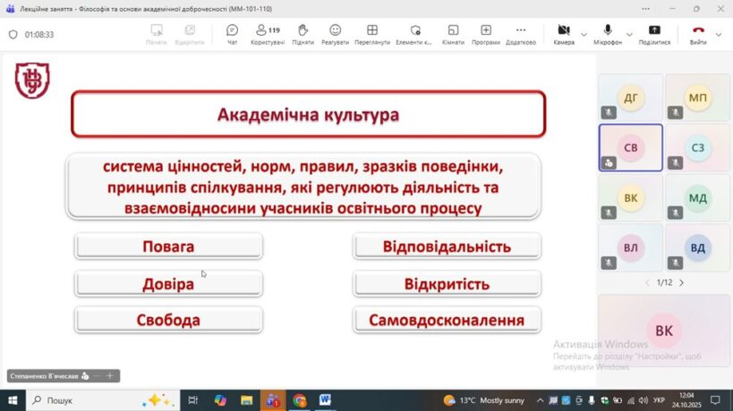 Викладач розкрив поняття академічної культури, наголосивши на її ключовому значенні у сучасному освітньо-науковому середовищі. Він підкреслив, що академічна культура є цілісною системою цінностей, норм, правил, зразків поведінки та принципів спілкування, які регулюють діяльність і взаємовідносини учасників освітнього процесу – науковців, викладачів і студентів. Основна мета академічної культури полягає у формуванні відповідального ставлення до освітньої та науково-дослідної діяльності, розвитку критичного мислення, взаємоповаги, толерантності й професійної етики. Дотримання її принципів забезпечує становлення освітнього простору, заснованого на довірі, відкритості та науковій доброчесності.