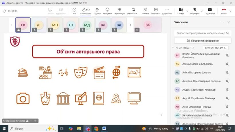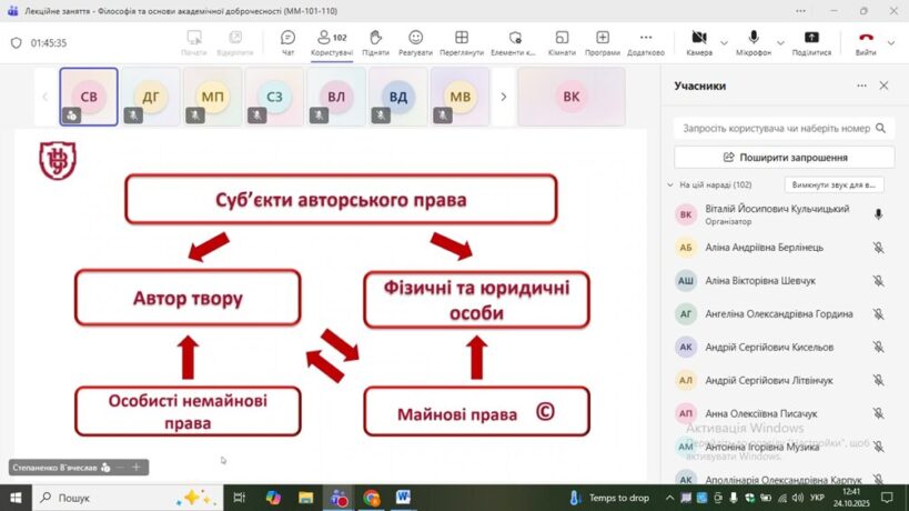 Лектор підкреслив, що розуміння сутності та ролі суб’єктів авторського права є важливою складовою правової культури здобувачів освіти, адже саме від їхньої обізнаності залежить захист результатів інтелектуальної діяльності. Він зазначив, що суб’єкти авторського права – це фізичні або юридичні особи, яким належать особисті немайнові та (або) майнові права на твори науки, літератури і мистецтва. До них передусім належать автори творів, а також їхні спадкоємці чи особи, яким автор або спадкоємці передали відповідні права. Усвідомлення своїх прав і обов’язків у цій сфері сприяє формуванню відповідального ставлення до інтелектуальної власності, дотриманню етичних норм і розвитку культури академічної доброчесності в освітньому середовищі.