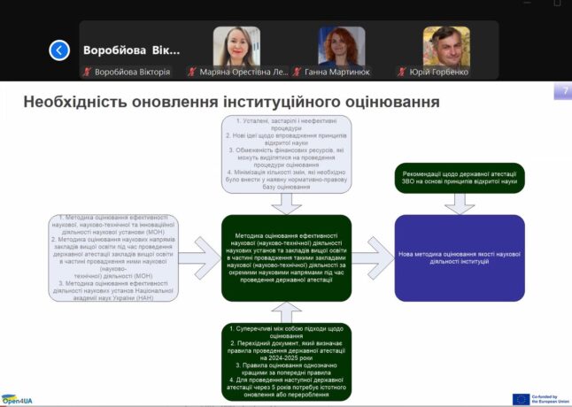 Під час семінару виступили Ольга Полоцька, виконавчий директор Національного фонду досліджень України «Рекомендації щодо впровадження принципів CoARA в політики та практики оцінювання наукових проєктів національними надавачами коштів».