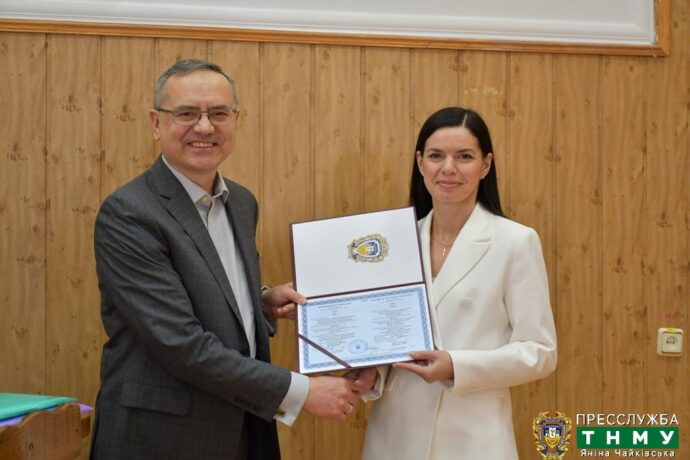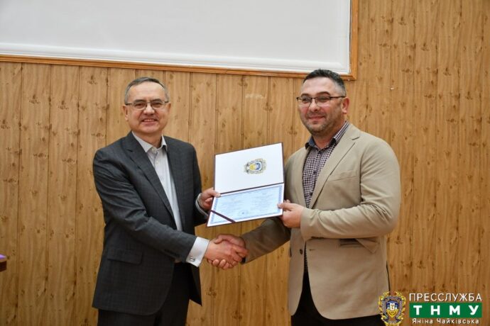 Перед початком засідання в урочистій обстановці Михайло Михайлович вручив дипломи доктора філософії Дзіх Ірині Сергіївні і Земляку Олександру Степановичу.