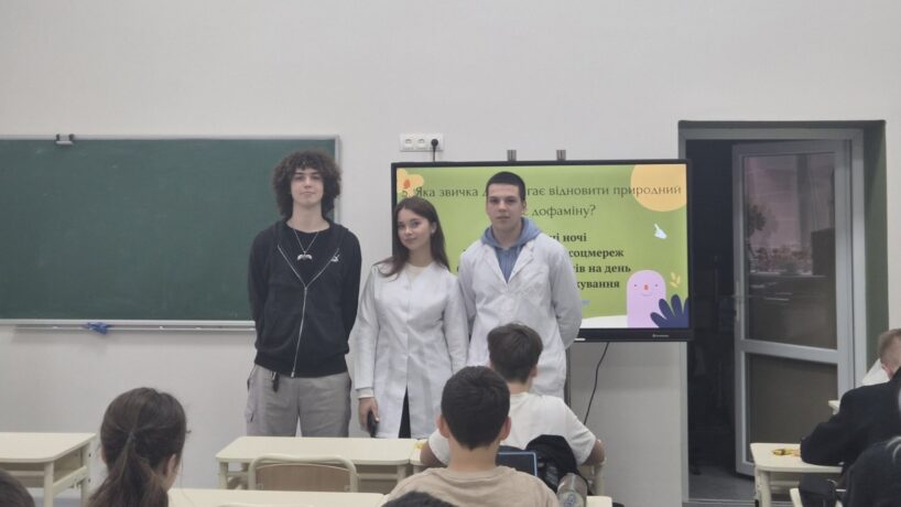 Під час лекції школярі ознайомилися з тим, як чотири основні гормони – дофамін, серотонін, ендорфіни та окситоцин – впливають на нашу життєдіяльність, зокрема на настрій, памʼять, сон, концентрацію та здатність ефективно навчатися. Студенти пояснили ключові механізми їхньої дії та розповіли про прості щоденні звички, які допомагають підтримувати емоційний баланс і покращувати загальне самопочуття.