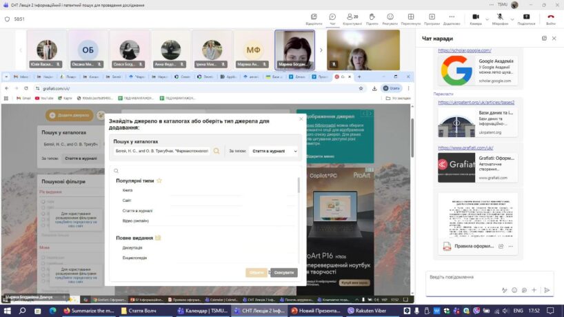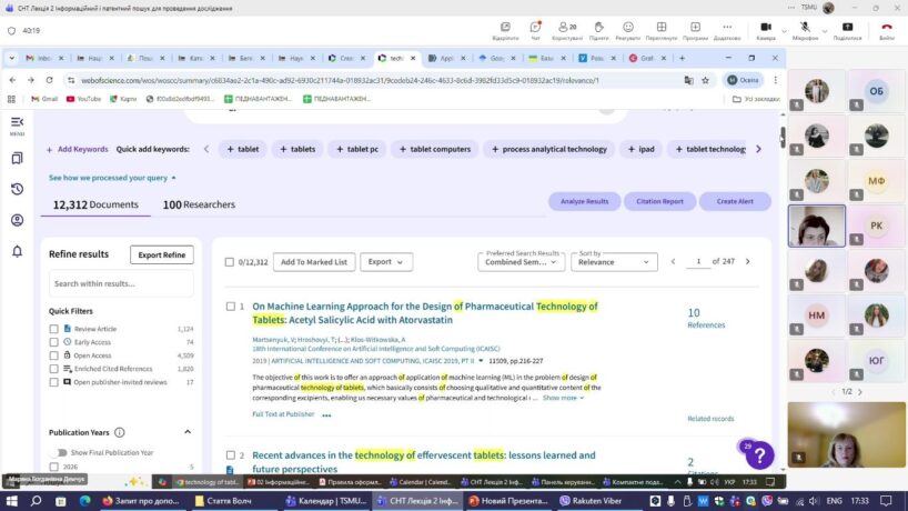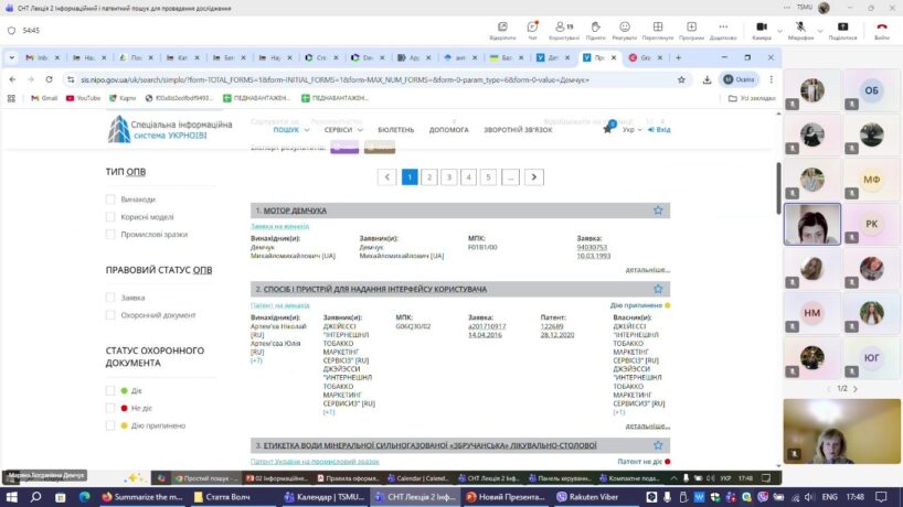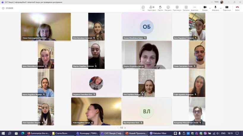 На кафедрі управління та економіки фармації з технологією ліків під головуванням завідувачки кафедри, доцентки Мар’яни Демчук для студентів V-го курсу денної та заочної форм навчання відбувся онлайн-семінар на тему «Інформаційний та патентний пошук для проведення дослідження».