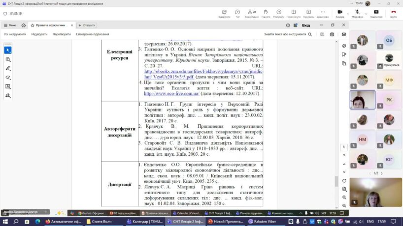 Під час заходу здобувачі вищої освіти ознайомилися з основними стратегіями пошуку релевантних літературних джерел для обґрунтування актуальності наукового дослідження, написання кваліфікаційної роботи, зокрема першого розділу – огляду літератури. Особливу увагу звернули на вимоги ВАК України щодо належного оформлення різних типів інформаційних джерел (статей, монографій, дисертацій, інтернет-ресурсів).