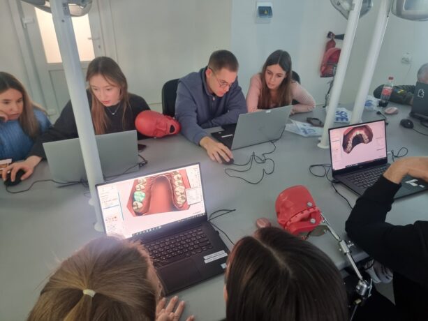 Другий день заходу був присвячений відпрацюванню практичних навичок. Учасники виконали інтраоральне сканування зубних рядів — ключовий етап сучасної ортодонтичної діагностики. Студенти ознайомилися з роботою інтраоральних сканерів, процесом сканування. Кожний учасник відпрацював навички сканування на колезі. Завдяки спеціалізованим цифровим програмам створювали власні плани лікування з використанням елайнерів.