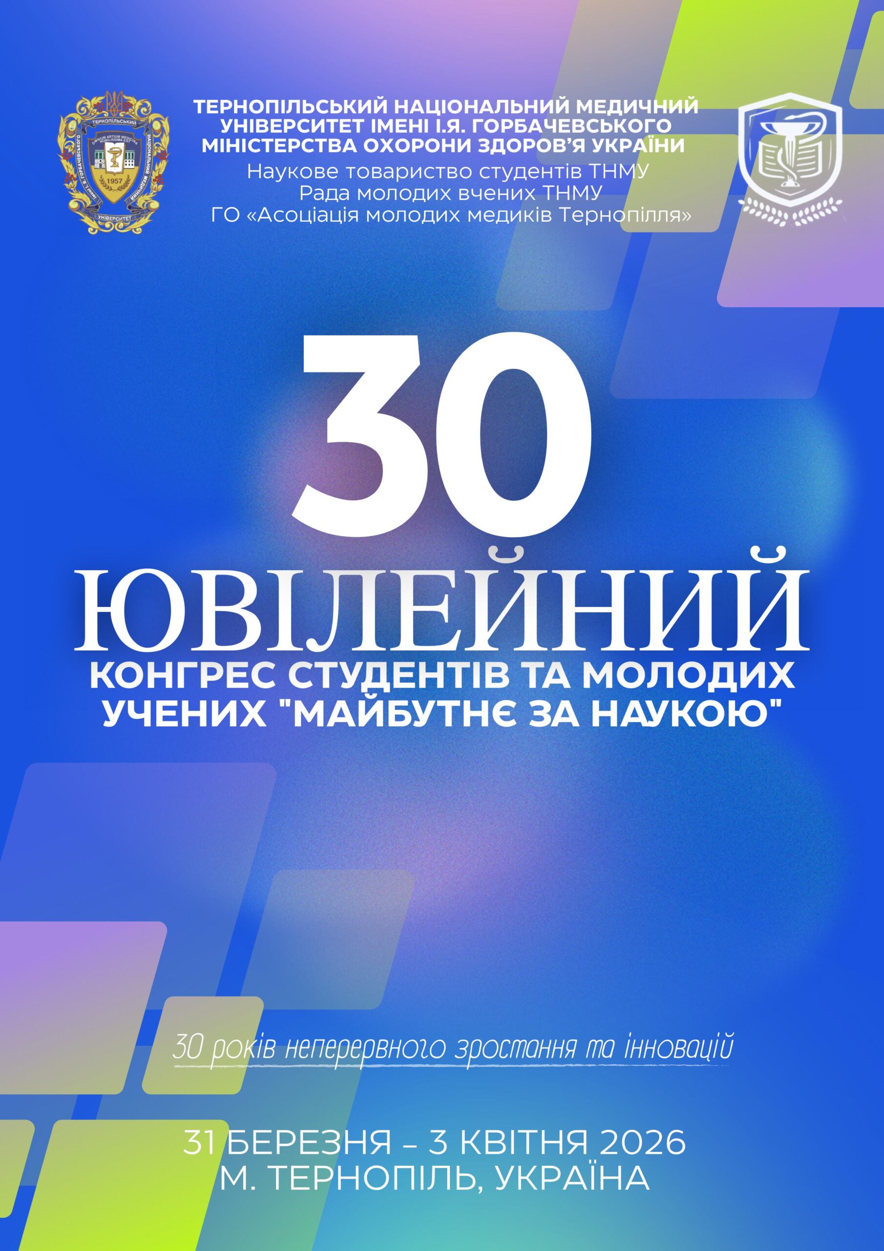 Наукове товариство студентів та Рада молодих вчених Тернопільського національного медичного університету імені І.Я. Горбачевського Міністерства охорони здоров’я України запрошує вас взяти участь у XXX Конгресі студентів та молодих учених «Майбутнє за наукою», який відбудеться у м. Тернопіль з 31 березня по 03 квітня 2026 року.