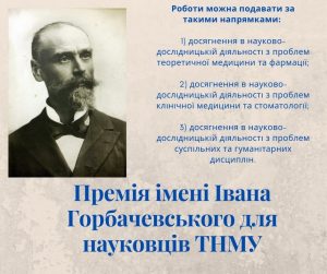 Шановні науковці! Тернопільський національний медичний університет імені І.Я. Горбачевського МОЗ України оголошує конкурс наукових робіт на присудження премії імені Івана Горбачевського Премія призначається науковцям…