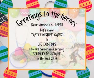 З наближенням Воскресіння Христового студенти Тернопільського національного медичного університету імені І.Горбачевського розпочинають доброчинну акцію «Великодня листівка медикам ООС». Її метою є виготовлення вітальних великодніх листівок…