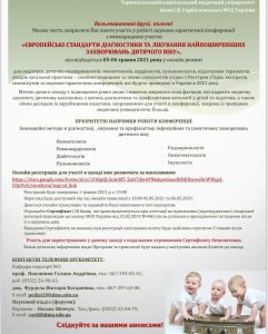 Науково-практична конференція з міжнародною участю «ЄВРОПЕЙСЬКІ СТАНДАРТИ ДІАГНОСТИКИ ТА ЛІКУВАННЯ НАЙПОШИРЕНІШИХ ЗАХВОРЮВАНЬ ДИТЯЧОГО ВІКУ» відбудеться 5-6 травня 2021 року у онлайн режимі для педіатрів, дитячих…
