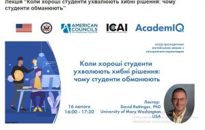 16 лютого (вівторок) о 16.00 відбудеться лекція радника проєкту “Ініціатива академічної доброчесності та якості освіти”, почесного президента Міжнародного центру академічної доброчесності Девіда Ретінджера “Коли хороші…