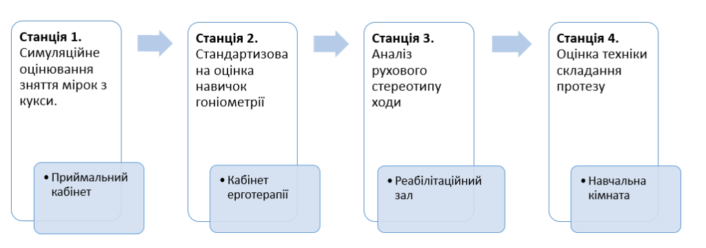 The first experience of conducting an OSCE for prosthetics and orthotics students confirmed the effectiveness of this format as a tool for objectively assessing practical skills and clinical reasoning. The use of standardized stations allowed for a unified approach to evaluation, identification of strengths and weaknesses in student training, and improvement of the educational process in accordance with international standards. This type of examination is an important step toward ensuring the quality of specialist training and enhancing the professional competence of future prosthetists and orthotists.
