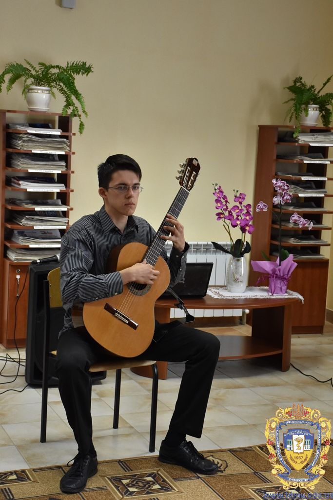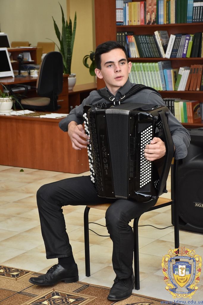 All present were treated to a concert featuring live performances by students of Ternopil Regional State Music School, winners of nationwide competitions. The young performers presented the best possible gift to the librarians on their holiday ; MC Alina Chornii was joined by Bohdan Koval (accordion), Vitaliy Hormusiak (bandura), Volodymyir Paratsii (guitar), Stepan Buranych (accordion), Maria Korczak (singing and playing the bandura).