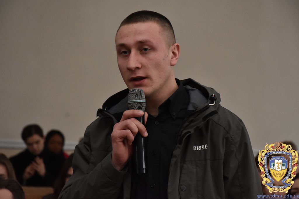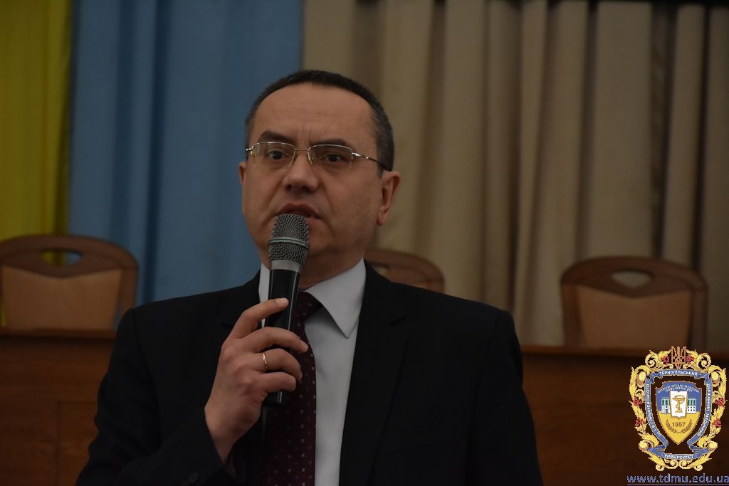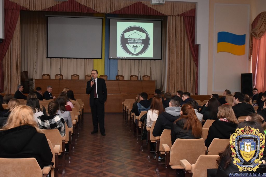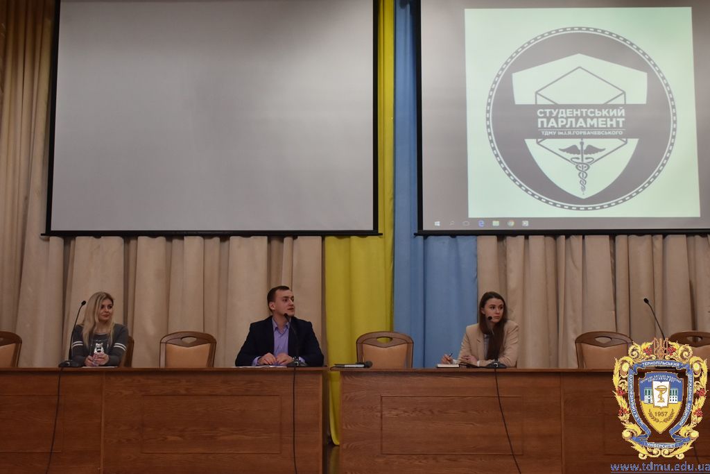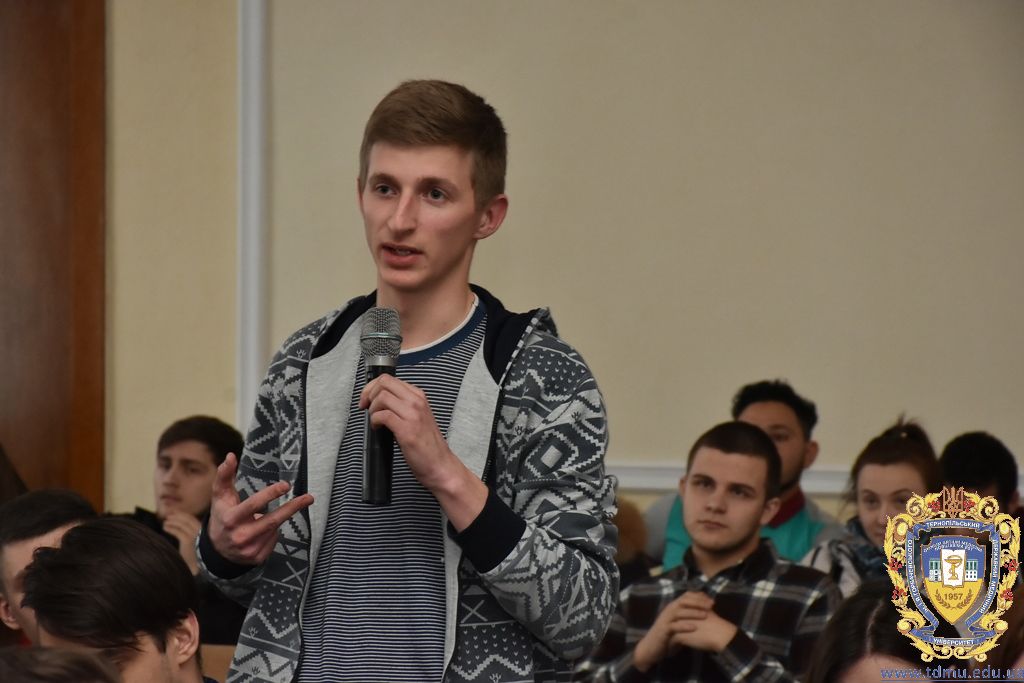 A traditional meeting of Ternopil State Medical University rector Professor Mykhaylo Korda with the student body took place on March 13, 2017. This was the day of TSMU student conference, when the doctors in training gathered to review the report of Student Council Audit Committee and approve its budget for next year.