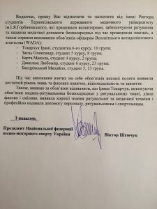 Victor Shemchuk, President of the National Federation of Water Motor Sports of Ukraine in his letter addressed to Ternopil State Medical University, thanked TSMU students for their participation and volunteer work during the European Championship of Water and Motor Sport . The event took place in in Ternopil at the end of August.