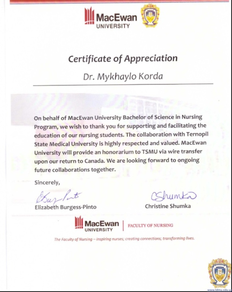 Ukrainian organizers of the course would like to express their appreciation to Canadian students for their interest in Ukraine and active participation in this course and to Ukrainian students: Volodymyr Lukyanenko, Sergiy Lukyanenko, Natalya Sobolta, Grigory Matyuk, Yaryna Stepanyuk, Jana Gruntenko and Ostap Saturskiy for their hard work both in and out of the classroom. The organizers would like to thank to Canadian instructors Elizabeth Burgess-Pinto and Christine Shumka, who developed and implemented the joint Ukrainian-Canadian course, and to dean of the Faculty of Nursing of MacEwan University, Vince Salyers, who fully supported the project. Yuri Konkin, Director of MacEwan University Ukrainian Resource and Development Centre is a long-time friend of TSMU and had made an invaluable contribution to the implementation of this project. TSMU rector Prof. Mykhailo Korda and Director of the Institute of Nursing Svitlana Yastremska ensured logistical and organizational support during this course.