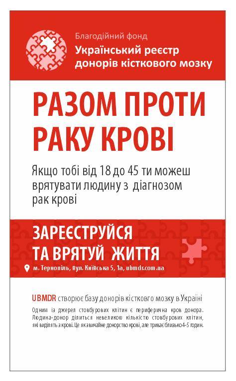 Recently, Ternopil residents organized the first non-governmental registry of bone marrow donors. This idea stemmed the dire need for marrow transplants. Currently in Ukraine these surgeries are not performed, while such operations abroad can cost up to 100 thousand dollars. Half of this cost goes for the search and selection of a donor. Those in need of bone marrow transplants have only 25% chance of finding a suitable family donor, requiring the rest to look for non-related donors in the registries of hematopoietic stem cells.