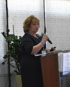 Professor Natalia Banadyha is delivering a report at the plenary session.