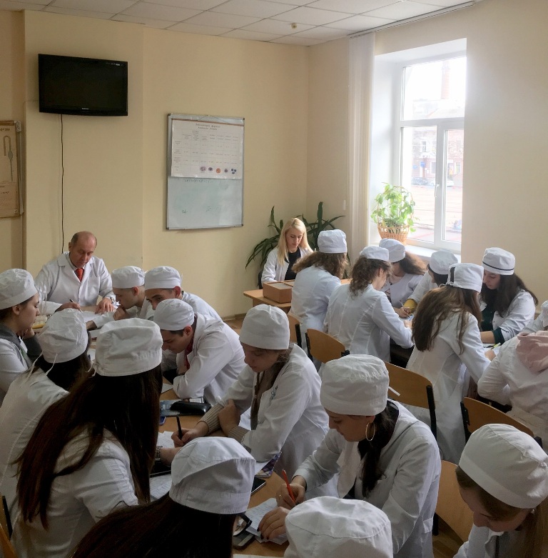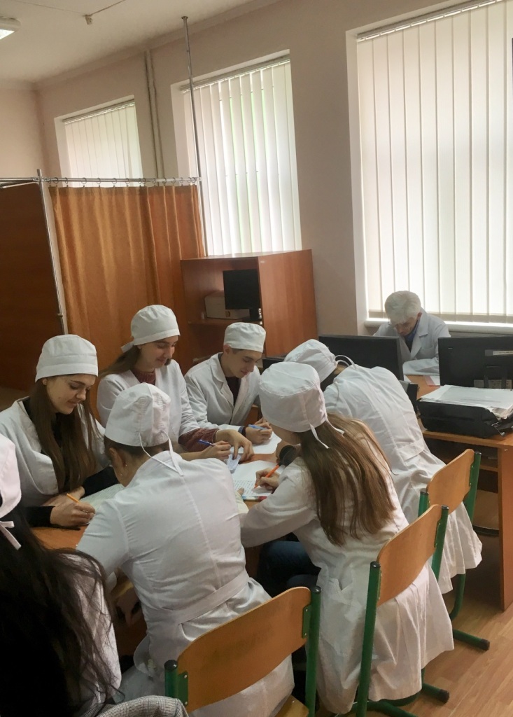 Professor Vadziuk S. N. and Assistant Kashchak T. V. are writing radio dictation with medical students.