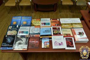 The following textbooks were presented to our departments: «Harrison’s Principles of Internal Medicine» (J. Larry Jameson, Anthony S. Fauci, Dennis L. Kasper, Stephen L. Hauser, Dan L. Longo, Joseph Loscalzo), «Basic and Clinical Pharmacology» (Bertram G/ Katzung), «Biology: Life on Earth» (Gerald Audesirk, Teresa Audesirk, Bruce E. Byers), «Netter’s Neurology» (Javanshri Shrinivasan, Claudia J. Chaves, Brian J. Scott, Juan E. Small), «Pathologic Basis of Disease» (Robbins and Cotran), «Guyton and Hall textbook of Medical Physiology», «Clinical Chemistry», «Medical Genetics», «Emery’s Element of Medical Genetics» (Peter Tumpenny, Sian Allard), «Nelson textbook of Pediatrics», «Medical Microbiology», «Medical Embryology».