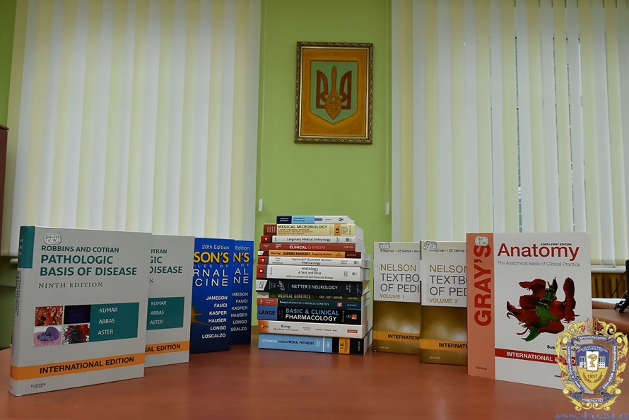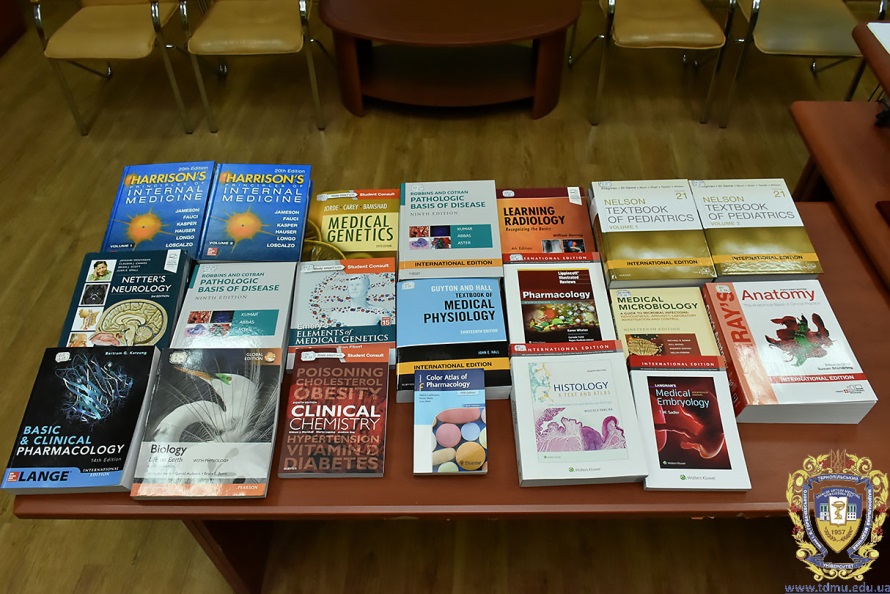 The following textbooks were presented to our departments: «Harrison’s Principles of Internal Medicine» (J. Larry Jameson, Anthony S. Fauci, Dennis L. Kasper, Stephen L. Hauser, Dan L. Longo, Joseph Loscalzo), «Basic and Clinical Pharmacology» (Bertram G/ Katzung), «Biology: Life on Earth» (Gerald Audesirk, Teresa Audesirk, Bruce E. Byers), «Netter’s Neurology» (Javanshri Shrinivasan, Claudia J. Chaves, Brian J. Scott, Juan E. Small), «Pathologic Basis of Disease» (Robbins and Cotran), «Guyton and Hall textbook of Medical Physiology», «Clinical Chemistry», «Medical Genetics», «Emery’s Element of Medical Genetics» (Peter Tumpenny, Sian Allard), «Nelson textbook of Pediatrics», «Medical Microbiology», «Medical Embryology».