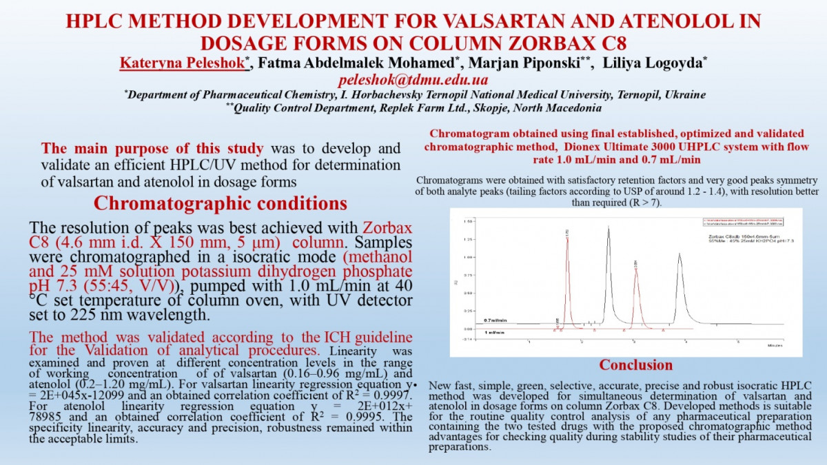 Poster report by the PhD student Kateryna Peleshok, the Assistant Professor of the Department of Pharmaceutical Chemistry and Professor Lilia Lohoida
