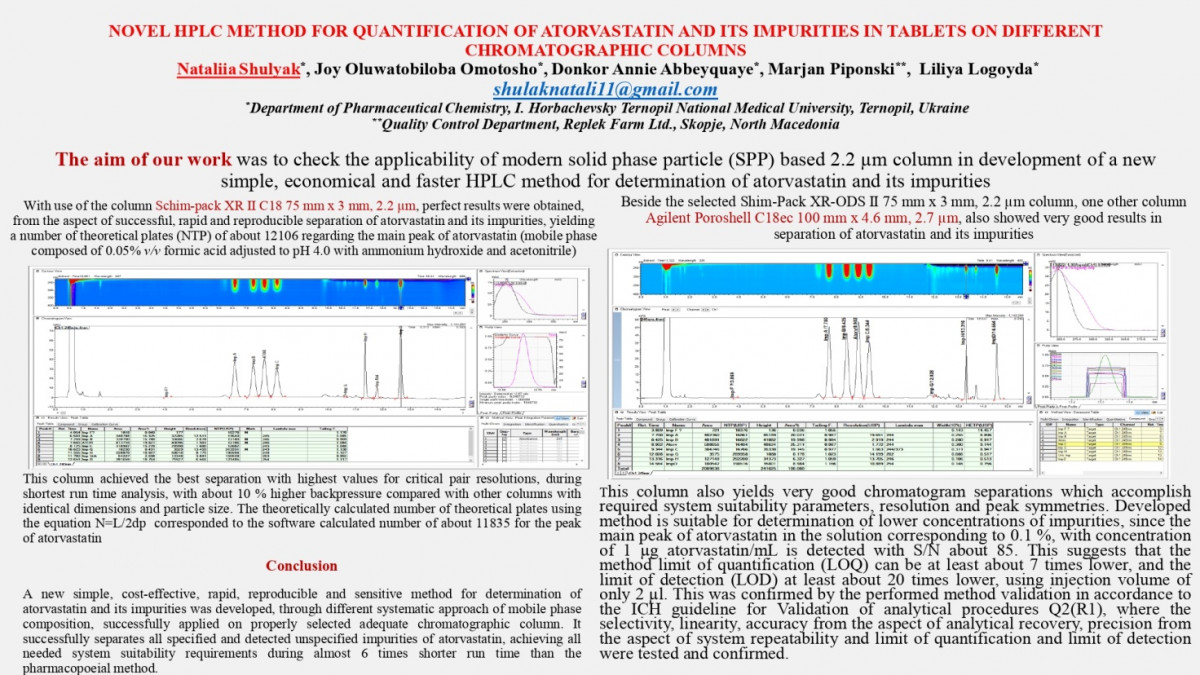 The post-graduate student Olha Skrynchuk and Lyudmila Slobodianiuk, the Assistant Professor of the Department of Pharmacognosy and Medical Botany, presented the results of research on “Determination of carboxylic acids of Crambe cordifolia and Crambe koktebelica roots” (academic advisor – Professor Svitlana Marchyshyn), as well as the post-graduate student Lilia Kostyshyn and Lilia Budniak, the Assistant Professor of the Department of Pharmacy Management, Economics and Technology, – on “Determination of amino acids content in Saponaria officinalis L.” (academic advisor – Professor Svitlana Marchyshyn), as well as the PhD student, Kateryna Peleshok, the Assistant Professor of the Department of Pharmaceutical Chemistry, – on “HPLC method development for valsartan and atenolol in dosage forms on column Zorbax C8” (academic advisor – Professor Lilia Lohoida) and Natalia Shuliak, a post-graduate student of the Department of Pharmaceutical Chemistry, – on “Novel HPLC method for quantification of atorvastatin and its impurities in tablets on different chromatographic columns” (academic advisor – Professor Lilia Lohoida).