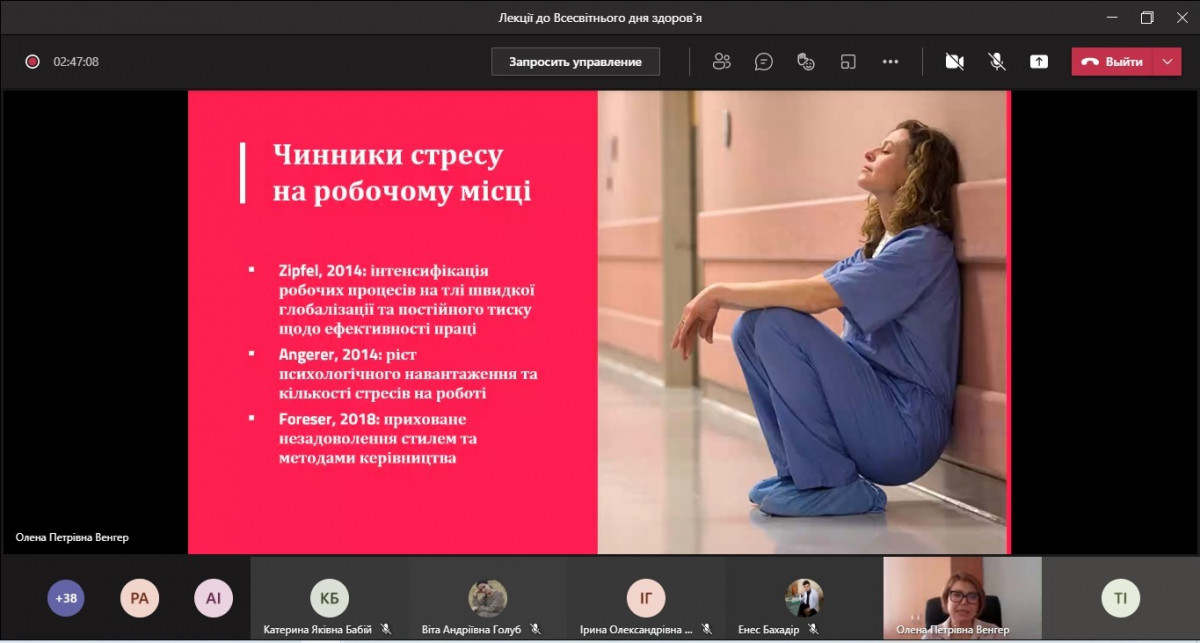 During the event, the head of the department, doctor of medical sciences, Professor Olena Petrivna Venher delivered a lecture on “Professional burnout”. She spoke about the features of burnout syndrome and shared practical tips for its prevention. As shown by numerous studies in different countries around the world, burnout develops even in senior medical students. Constant communication with patients and their relatives, a continuous circle of complex human problems, negative emotions, fear, pain, as well as a sense of responsibility for life and recovery of patients, high competence and constant professional self-improvement all are reasons why health care workers are so vulnerable to emotional burnout. Olena Petrivna talked to students and shared methods of fighting this problem.