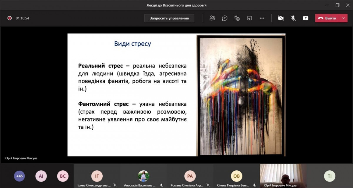 Doctor of Medical Sciences, Associate Professor Yurii Ihorovych Mysula talked to students on “Stress and stress resistance”. The well-being and emotional recovery of health workers is a priority, as these components are the key to their health, and thus to the health and quality of health care provided to the public during a COVID-19 outbreak. Therefore, it is extremely important to anticipate the stresses associated with professional responsibilities and develop support for health professionals. Yuriy Ihorovych shared interesting information about the significance of stress in our lives and recommendations on how to deal with it.