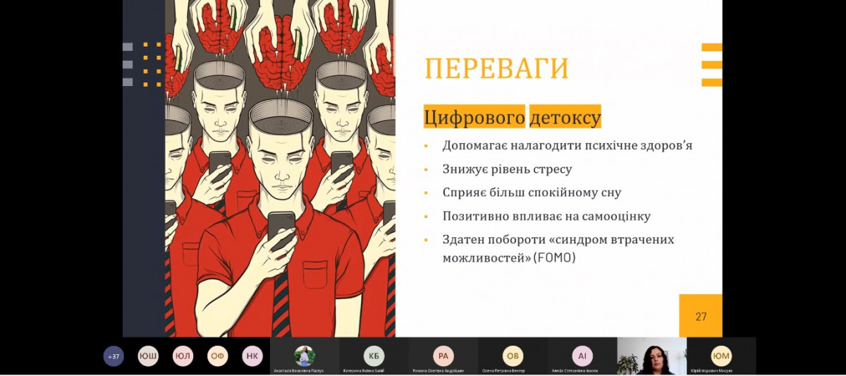 Assistant Professor of the department Tetiana Ivanivna Ivanytska delivered a lecture on “Digital addictions”. She emphasized the urgency of this issue during the pandemic, talked about the neurobiological basis of this dependence, and shared methods of “digital detox”.