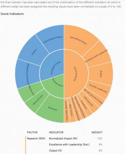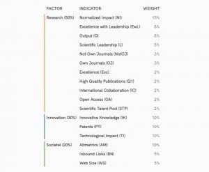 SCImago SIR evaluates scientific organizations on 17 indicators, which combine three groups of indicators based on research, innovation and public influence.