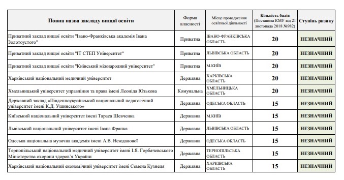Only 31 institutions of higher education have a low risk degree from economic activity. I. Horbachevsky Ternopil National Medical University is the only medical university in Ukraine that has the lowest risk degree.
