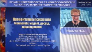 Professor Natalia Maruta, the Deputy Director for Research of the Institute of Neurology, Psychiatry and Addiction of the National Academy of Medical Sciences of Ukraine, Head of the Department of Neuroses and Border States of the Institute, Vice President of the Scientific and Practical Society of Neurologists, Psychiatrists and Addicts of Ukraine opened the plenary sessions with a report on “Preventive psychiatry (concept, models, experience, implementation)”.