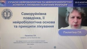 Professor Piliahina Halyna Yakivna, Head of the Department of Psychiatry, Psychotherapy and Medical Psychology of the P. Shupyk National University of Health of Ukraine presented a report on “Self-destructive behaviour, its neurobiological basis and principles of treatment”.