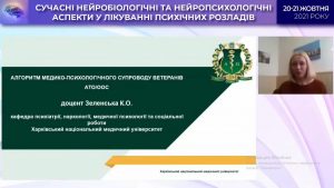 Zelenska Kateryna Oleksiivna, Associate Professor of the Department of Psychiatry, Addiction, Medical Psychology and Social Work of Kharkiv National Medical University, presented a report on “Algorithm of medical and psychological support of ATO / OOS veterans”.