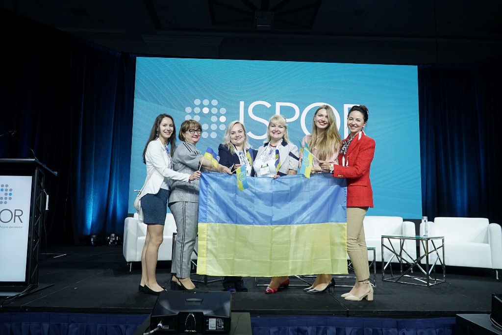 The whole hall applauded and greeted the delegation from Ukraine consisting of Oresta Pinyazhko, Ph.D. in Pharmaceutical Sciences, Director of the Medical Technology Assessment Department of the State Expert Centre of the Ministry of Health of Ukraine, President of the Ukrainian branch of ISPOR; Olha Zaliska, Doctor of Pharmacy, Professor, Head of the Department of Organization and Economics of Pharmacy, Drug Technology and Pharmacoeconomics at Danylo Halytsky Lviv National Medical University (LNMU); Oleksandra Oleshchuk, Doctor of Medicine, Professor, Head of the Department of Pharmacology and Clinical Pharmacology at I. Horbachevsky Ternopil National Medical University; Sofia-Roksolana Hot, Ph.D. in Medicine and Zoriana Zabolotnia, Lecturer at the Department of Organization and Economics of Pharmacy, Drug Technology and Pharmacoeconomics at LNMU.