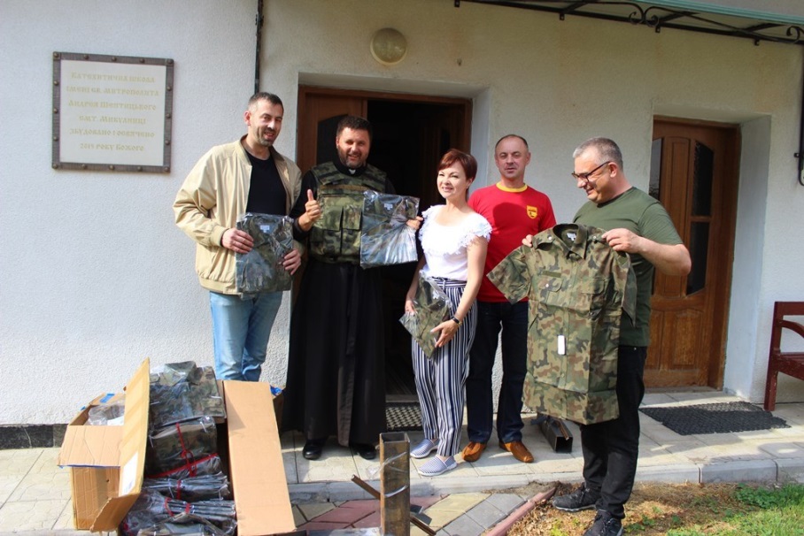 Volunteers took the opportunity to hand over military clothing and other equipment to Father Yevhen Vlokh, who personally took everything that was needed to the front line. It should be noted that tailoring of bulletproof vests and shoes has been established in Mykulyntsi.