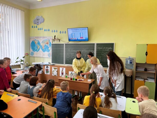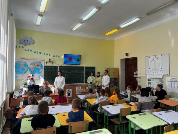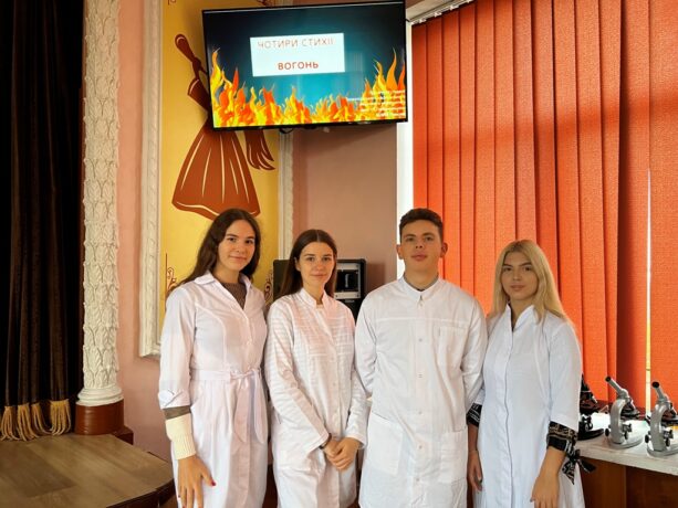 In January-April 2023, 2nd-year students of the Faculty of Medicine – Bohdanna Dovhaliuk, Sofiia Homonets, Sofiia Chornii, Yaroslav Bilyk – organized educational events for students of the 4th, 7th and 8th grades of comprehensive school No. 6 and students 4th grade of school No. 4 of the city of Ternopil, where they presented the elements of nature, namely the element of Earth, the element of Water, the element of Air and the element of Fire in an interesting educational and cognitive form.