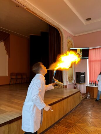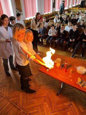 Pupils of secondary school No. 6 were introduced to the elements of Air, Fire, and Earth. During the educational event, the students of the university vividly demonstrated to schoolchildren the possibilities of their use by humans, analysed the benefits and harms of these elements. Children of the 7th-8th grades had the opportunity not only to observe the conduct of interesting and exciting experiments: “Tablet for heartburn”, “Oxygen-free dome”, “Healthy breathing”, “Balloons”, but also to take part in their conduct.
